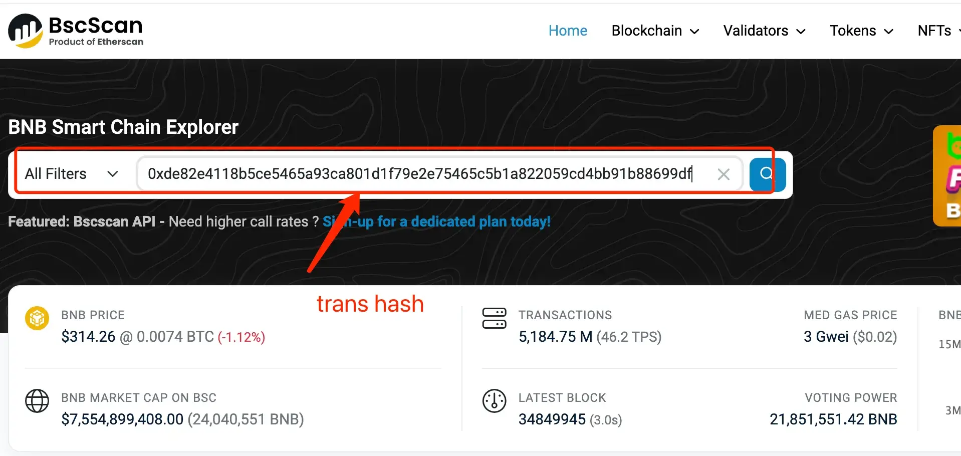 币安上的项目也比较多,因此这里也简单介绍下在币安智能链上查询USDT交易,使用 BscScan https://bscscan.com/ 即可完成: