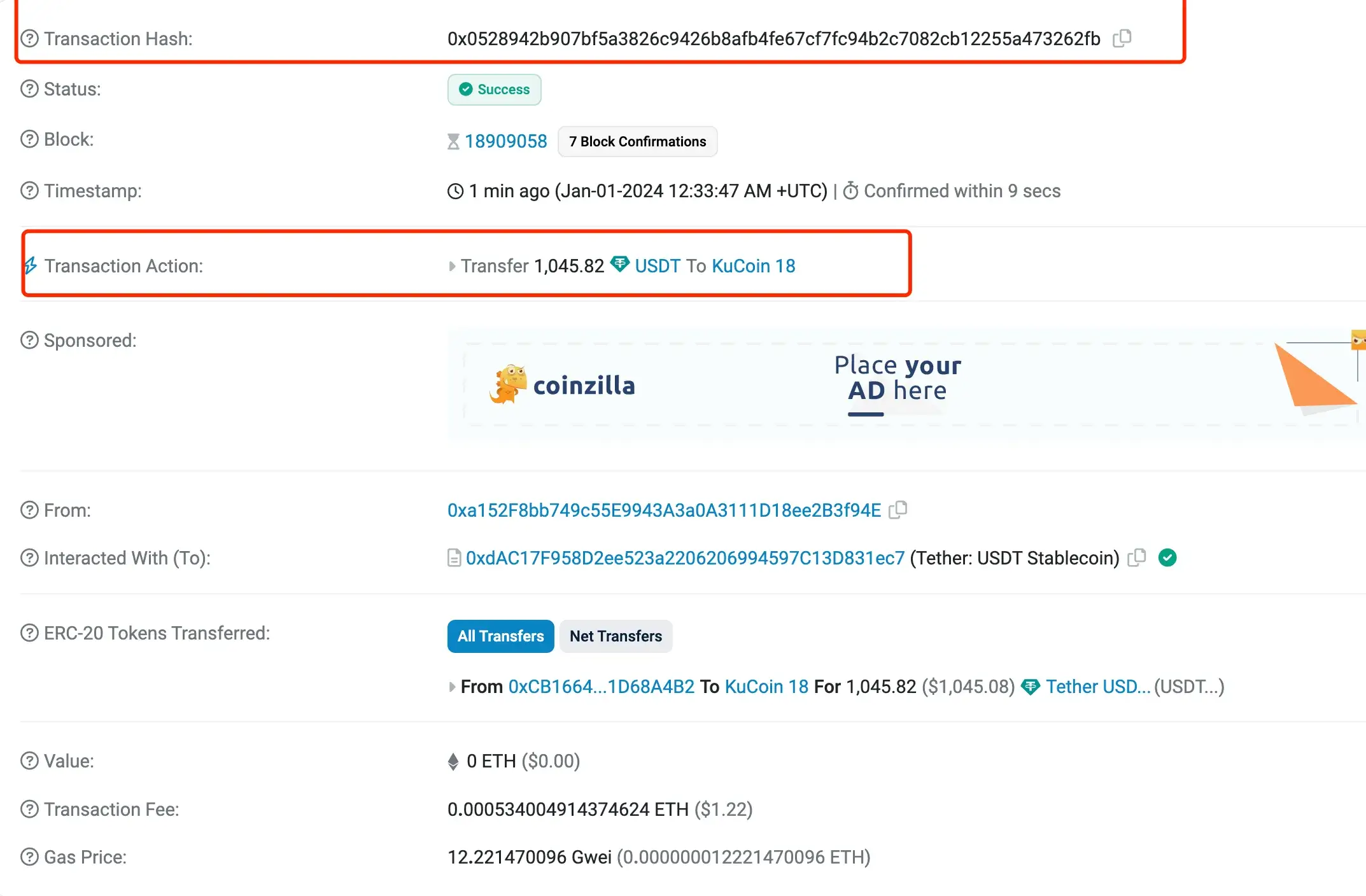 - Transaction Action,代表的是转账动作,上面截图就有具体的多少金额转账到哪里的一个提示,一般是标记的地址才会有,比如这里提示的是kucoin交易所;