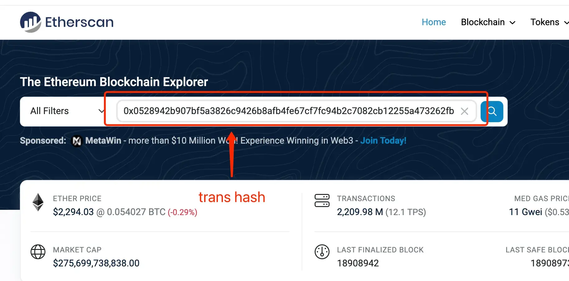 打开Etherscan网站,https://etherscan.io/ 并在搜索框中输入USDT交易的地址或交易哈希,这里有人会问什么是交易哈希。
