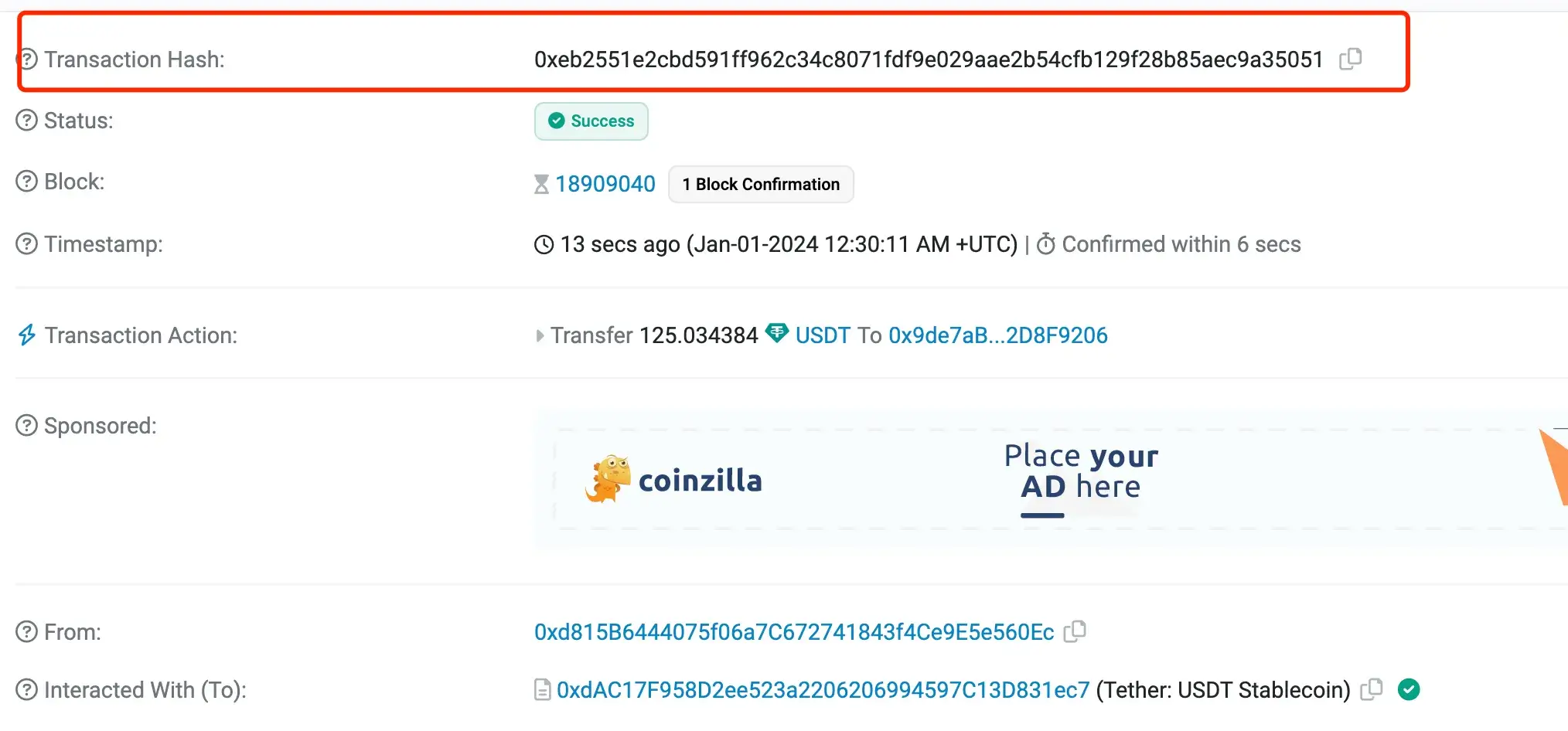 - Transaction Hash,这里就是刚说的交易哈希,作为链上的唯一标识,可以作为转账凭证查询的信息;