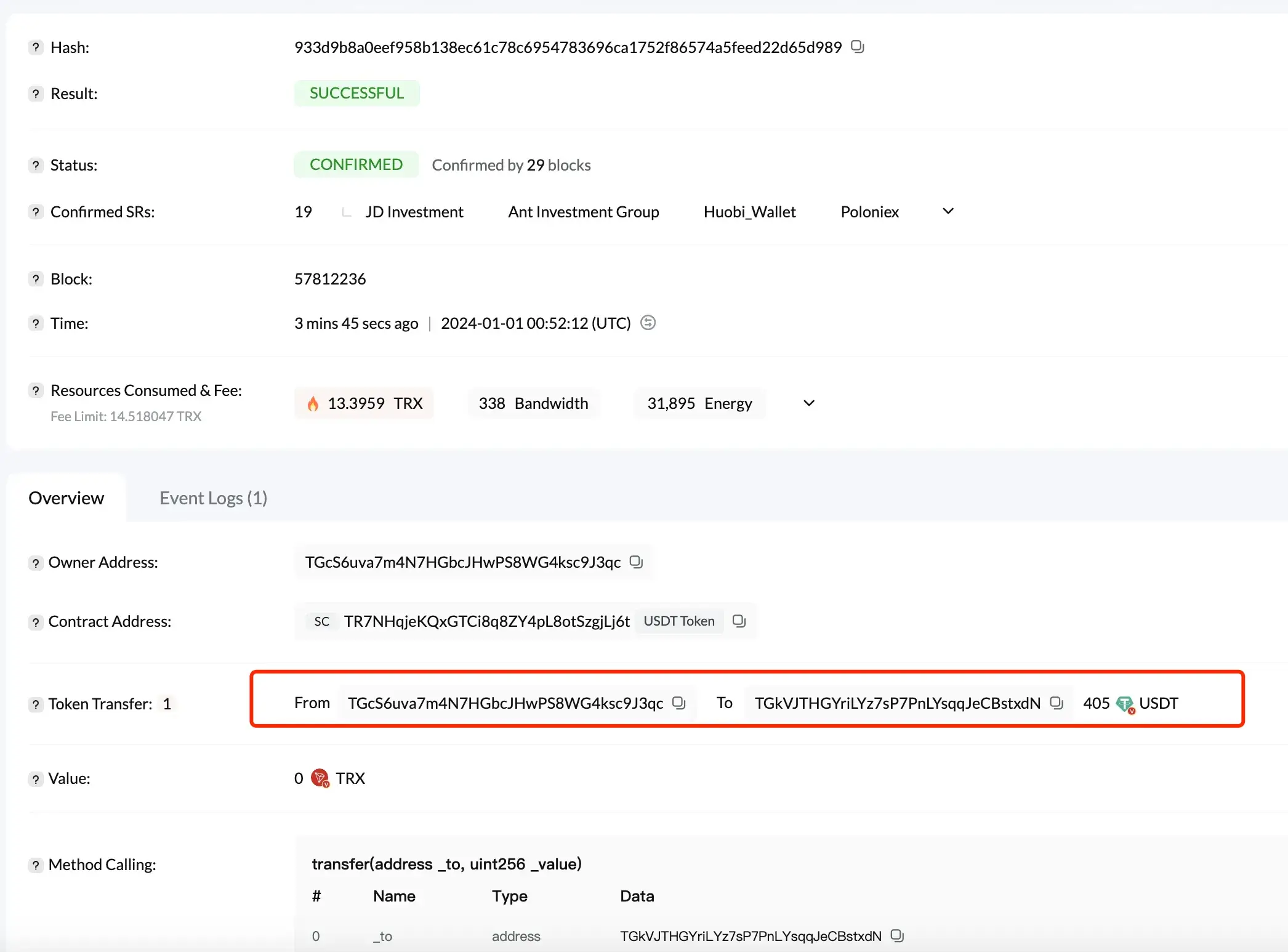 如果你会看以太坊的,那么 Tron 也基本会看了,只是这里需要注意的是,上面的转账金额在刚才以太坊一样的 Token Transfer 里面,你可以看到转账了 405 的USDT。其他的我就不过多解释了。