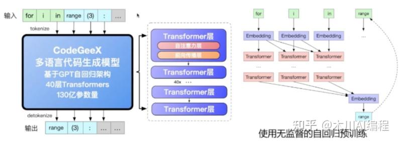 CodeGeex 模型基于 GPT 架构的自回归模型,由 40 层 transformer 组成,总计参数量达 130 亿(OpenAI 的 Codex 模型,具有 120 亿(12B)参数),它使用自然语言或代码 token 作为输入,输出下一个 token 的概率。