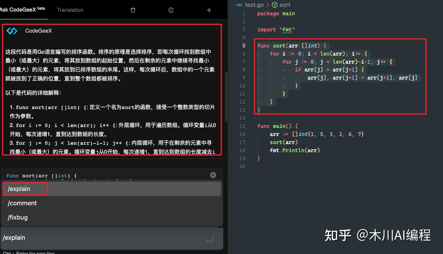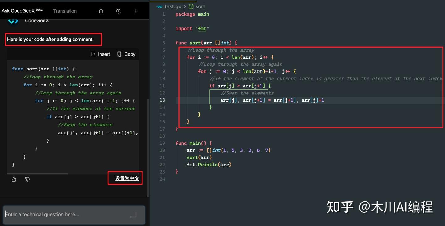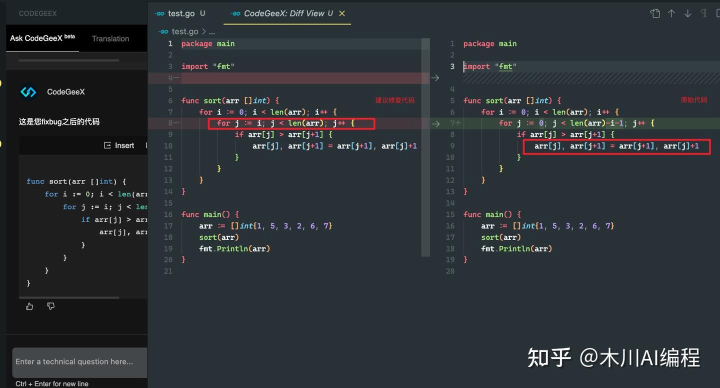 我故意将 arr[j], arr[j+1] = arr[j+1], arr[j] 调整成 arr[j], arr[j+1] = arr[j+1], arr[j],想让它修复下代码,提供了对比视图,左边是修改后的代码,右边是原始代码,可惜修复得不对,这方面还有待优化。