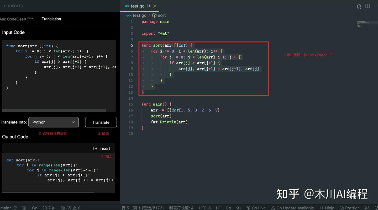 选中一段代码,然后点击 Ctrl+Alt+T 进入翻译模式,根据提示选择要翻译的目标语言,CodeGeeX 将自动识别当前编辑器中代码的语言,并进行翻译,点击翻译结果上方的“insert”即可将翻译结果插入文件。