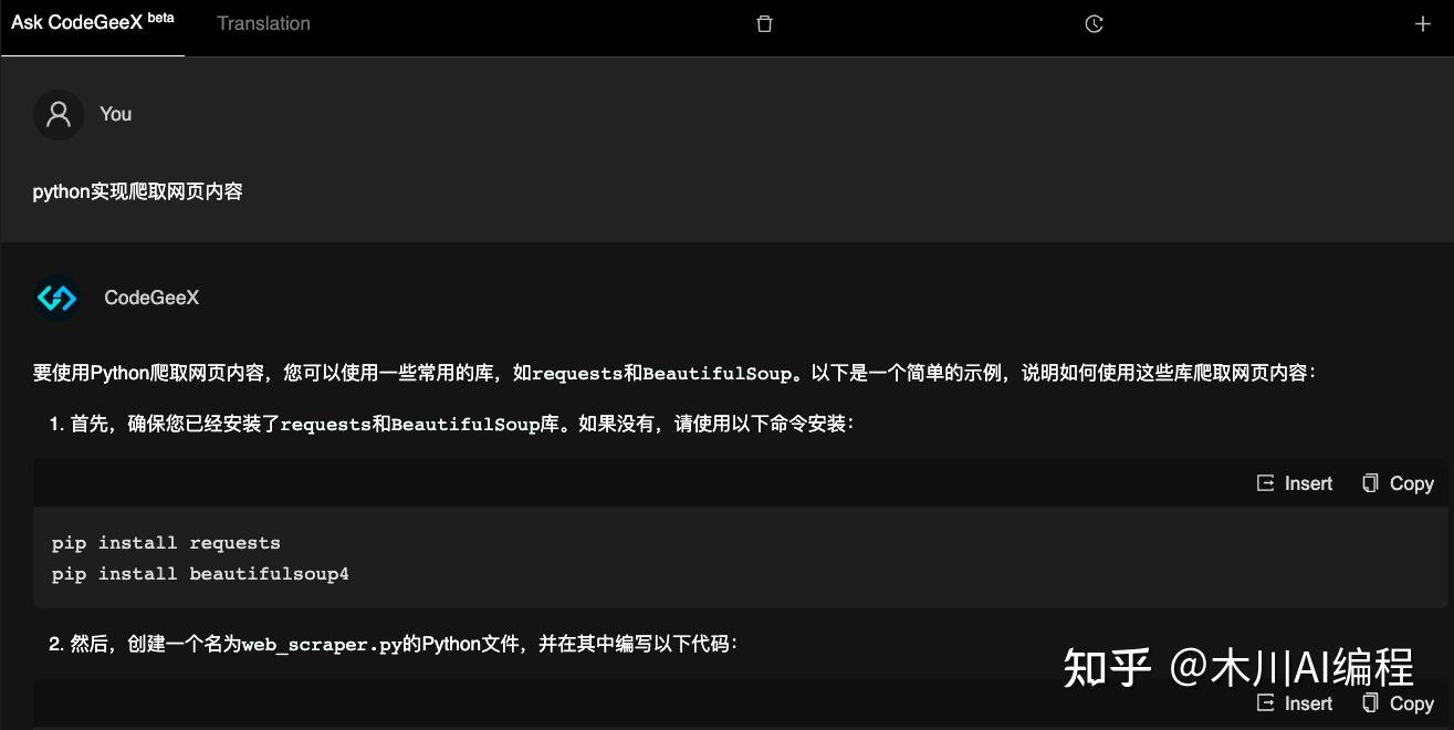 CodeGeeX 是清华大学知识工程实验室研发的一款基于大模型的全能的智能编程助手,它可以实现代码的生成与补全、自动添加注释、代码翻译以及智能问答等功能。