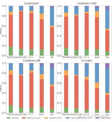 总共分为四种类型:语法错误、编译错误、输出错误、输出正确,语法错误和编译错误占比低,主要是输出错误。