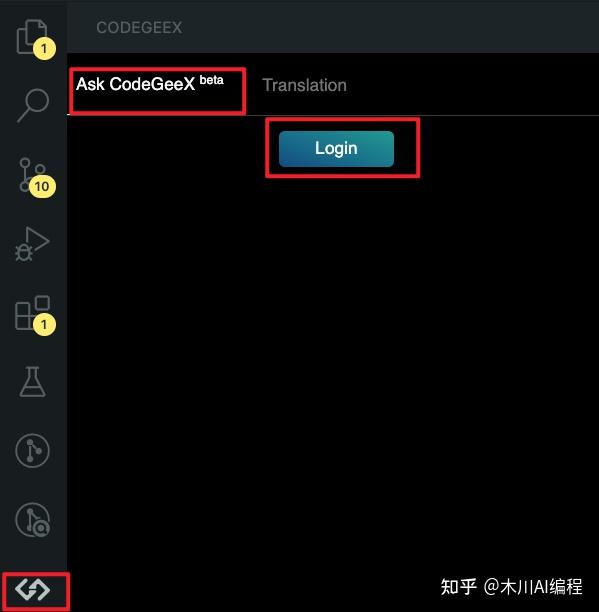 通过智能问答机器人可以实现其它扩展功能,左边菜单找到 CodeGeex 插件,点击 ”login“ 按钮登录即可与机器人聊天。